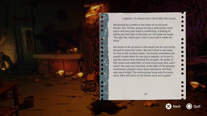 Usually, I find this type of storytelling obnoxious and dull. Rarely am I moved to sit and read through paragraphs of exposition that have been scattered around by an environment designer, because usually it’s obscenely boring compared to the thing I’m actually there to do (violence, usually). But Jusant’s story threads are, much like the rest of the game, paced and balanced to perfection in the sense that they’re never too long, and never appear with enough frequency that sifting through them feels like a chore. Indeed, you’ll gladly scour every cranny for scraps of prose. It’s here where Don’t Nod’s heritage as a narrative focused studio really shines through: the writing is impeccable, and compelling to the last word.