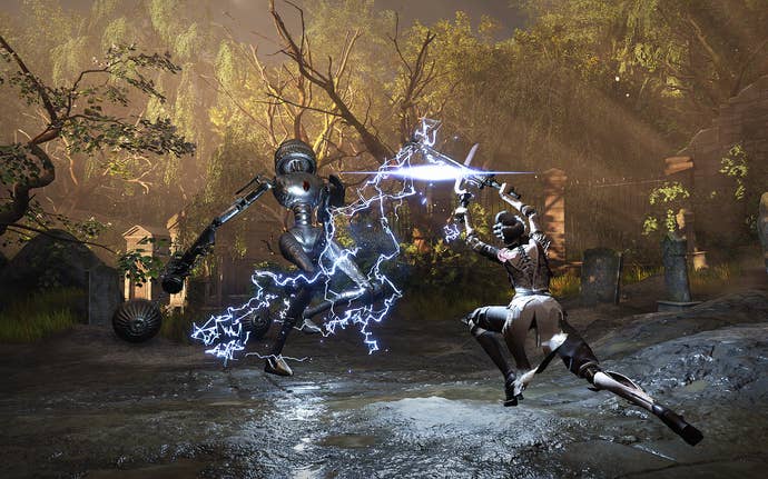 For what it’s worth, this foundation is fairly solid! Your movement as a French murder doll in the midst of combat has you weaving in-between attacks and string together powerful combos with a mix of regular, heavy, and special attacks. Put on enough pressure and you can break an enemy's posture, allowing you to land a single devastating attack. Backstabs aren’t here, but are instead replaced with a universal sneak attack you can land on any and all unaware automata. If you’re fiending for some of that Dark Souls-esque action, feats like these do indeed cause your brain to shoot off those sweet signals.
